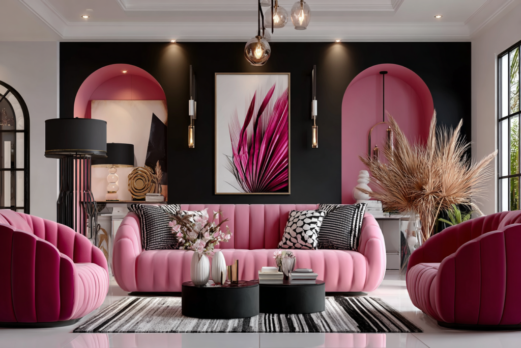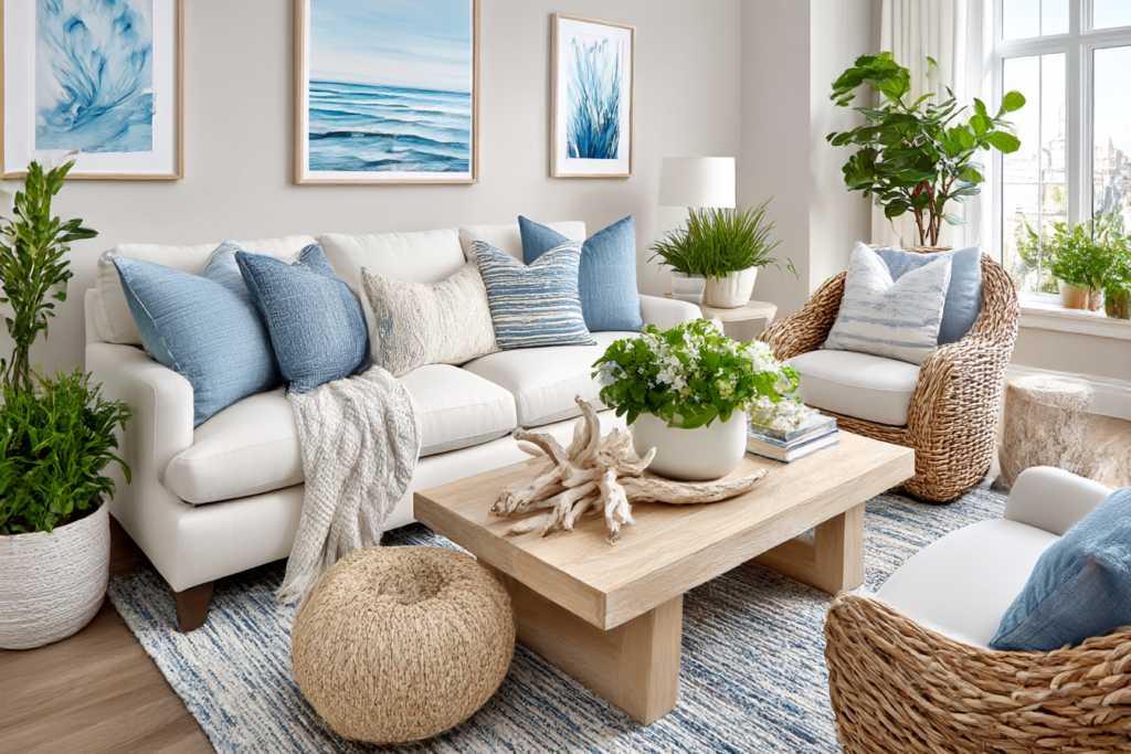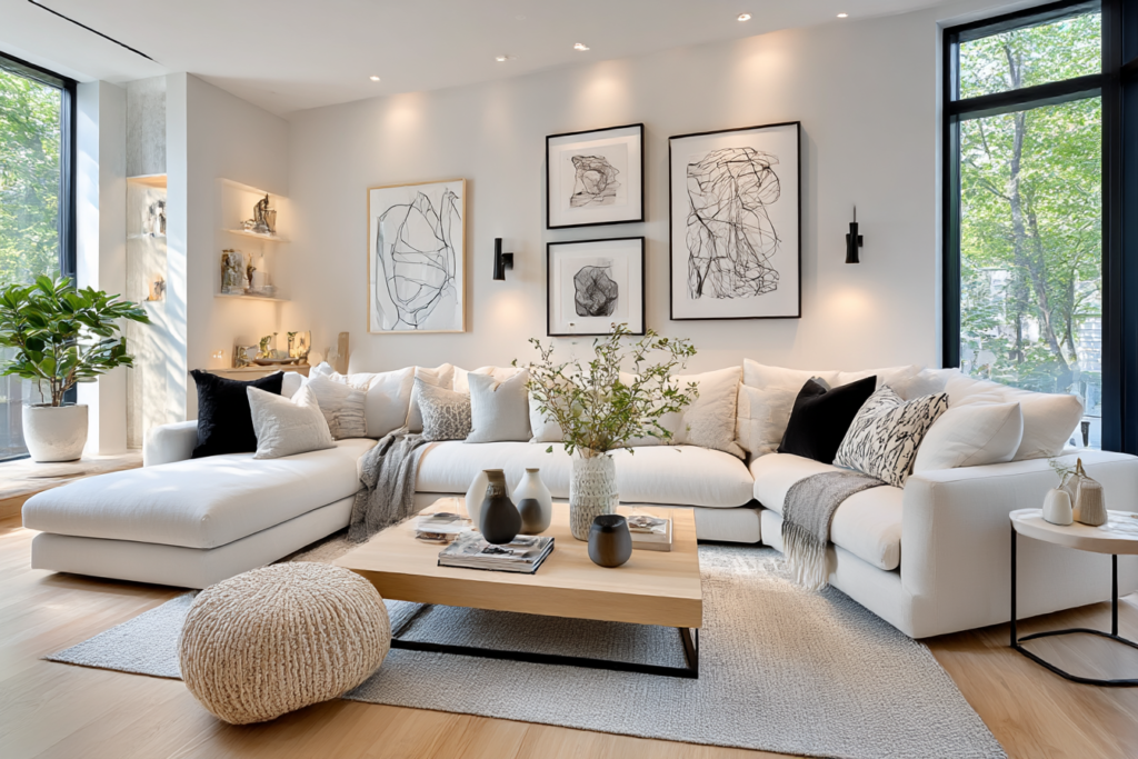 We used a textured rug and soft organic shapes to anchor it, making it look intentional and expensive.